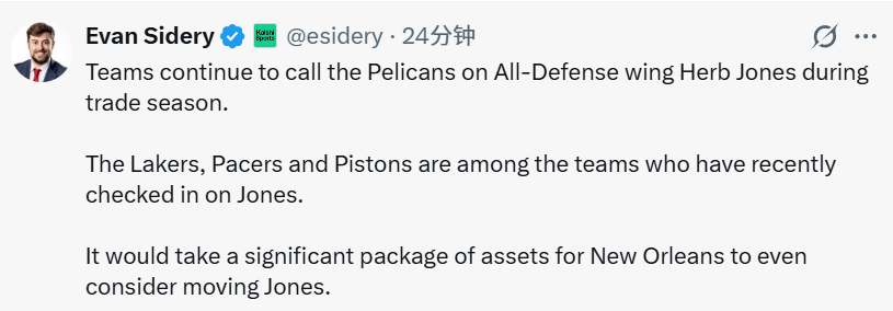 北京时间1月24日,据名记Sidery报道,交易窗口期,多支球队持续向新奥尔良鹈鹕队询价全明星级防守侧翼赫伯特-琼斯。洛杉矶湖人、印第安纳步行者以及底特律活塞均在近期就琼斯的交易可能性,向鹈鹕队进行了咨询。想要让鹈鹕队认真考虑放走琼斯,对方必须拿出一份包含大量优质筹码的交易方案。